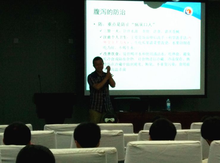 首先由闫庆贺副主任医师为大家讲解夏季常见消化系统疾病的防治。闫老师结合生理学知识,以图解的形式为大家讲解了病菌沿消化系统的入侵过程。同时教给大家口诀为“内外夹弓大立腕”的“科学洗手法”,并幽默的把口诀谐音为“大力丸”,引得全场捧腹。