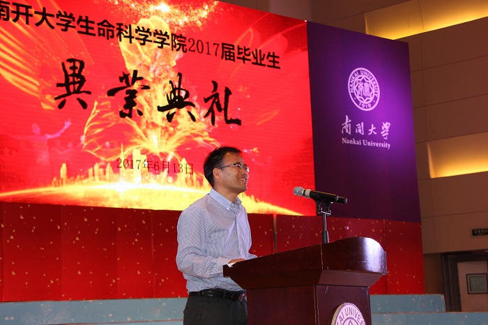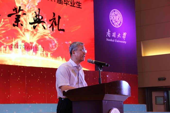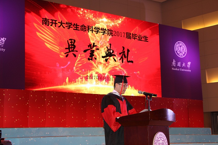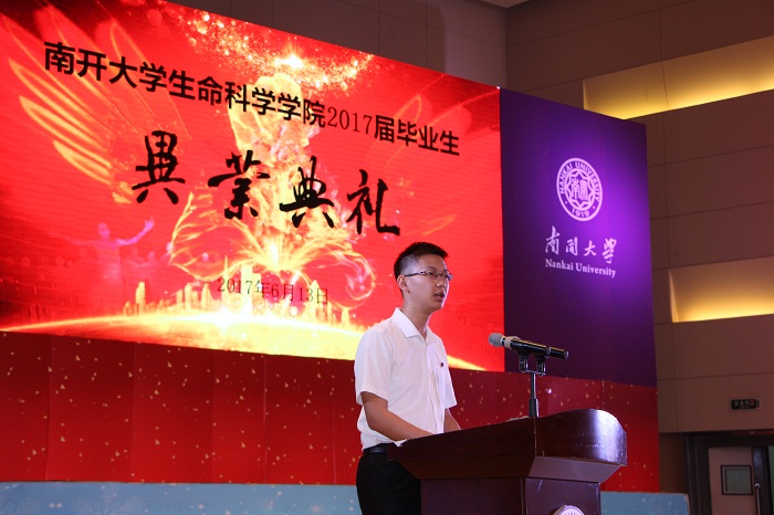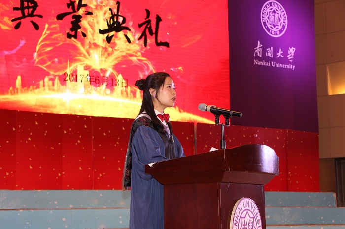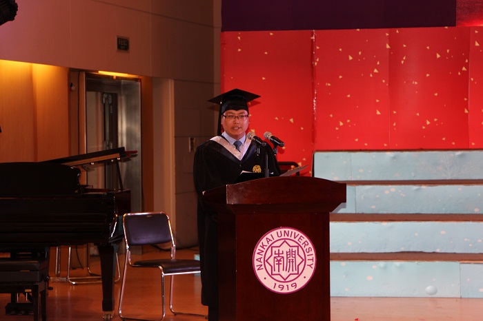 接着,王卓识、许广楠、张振国分别代表本硕博毕业生上台讲话。王卓识深情回忆了自己的老员工涯,谈到了在南开的收获和遗憾;许广楠结合自己在新疆支教的日子,谈到了自己对公能精神的理解,既有对母校的感谢,也表达出了一些建议;张振国博士曾经独自在野外度过了800天的科研生活,谈到这件事,他也是感慨颇多,在南开的科研生涯虽然辛苦,但是充实。三位毕业生代表都表达了对母校的眷念以及对未来生活的期待。