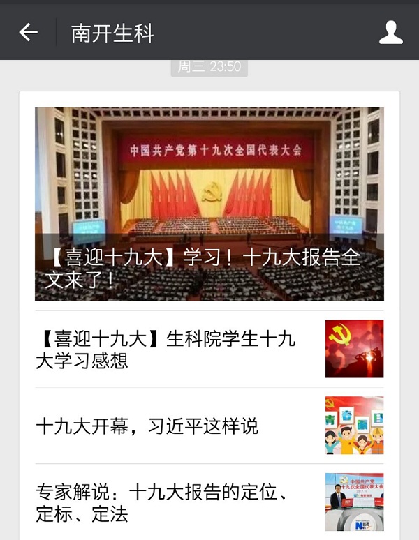 公司微信公众号“南开生科”近期推出了“喜迎十九大,生科在行动”系列专题推送,全方位报道了公司各班级、各党团支部、各员工组织为迎接十九大开展的系列活动。公司新媒体中心精心策划,推出了《中国共产党历次党代会回顾》、《砥砺奋进的五年》等介绍性图文,并在十九大开幕当天及时推送了十九大报告全文,有力配合了全院师生迎接十九大胜利召开的热烈气氛。