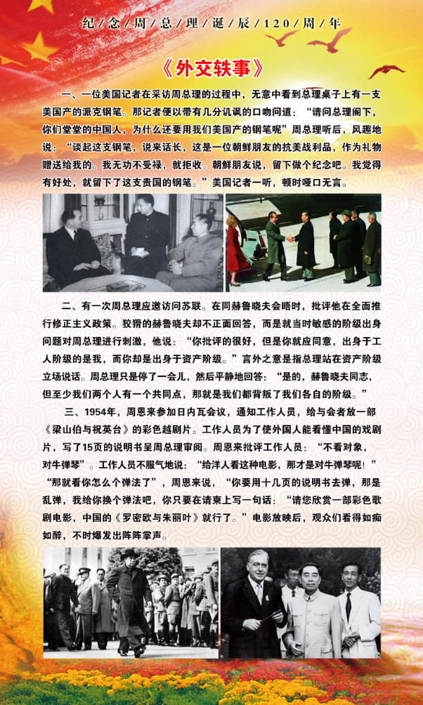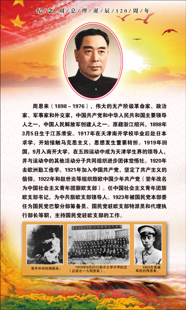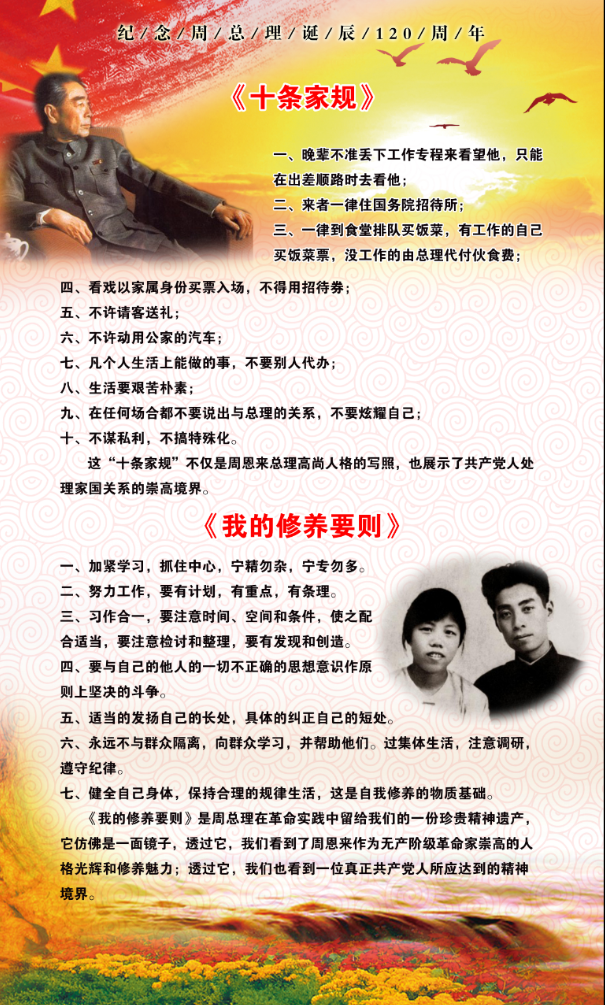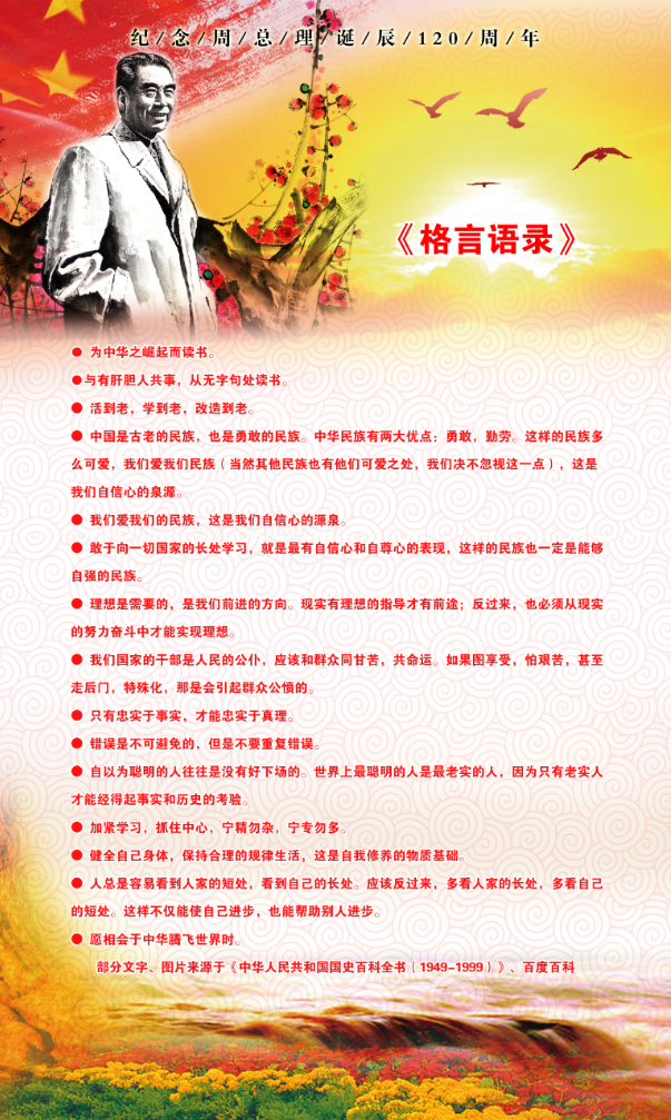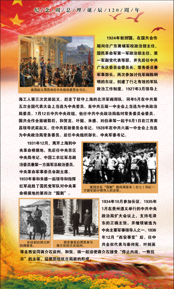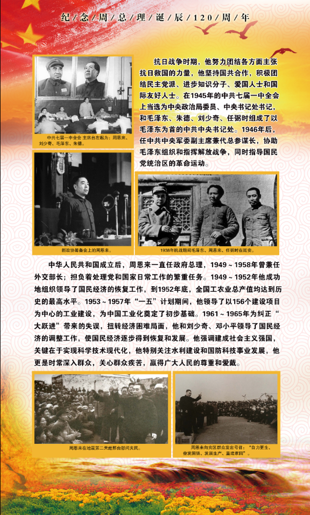 为纪念公司杰出员工周恩来诞辰120周年,3月3日,公司在生物站一楼走廊开展了纪念周恩来主题展览。展览回顾了周恩来同志波澜壮阔的一生,介绍了周恩来同志在各项事业上的丰功伟绩。展览还搜集了周总理的格言语录、家规修养,内容十分丰富。