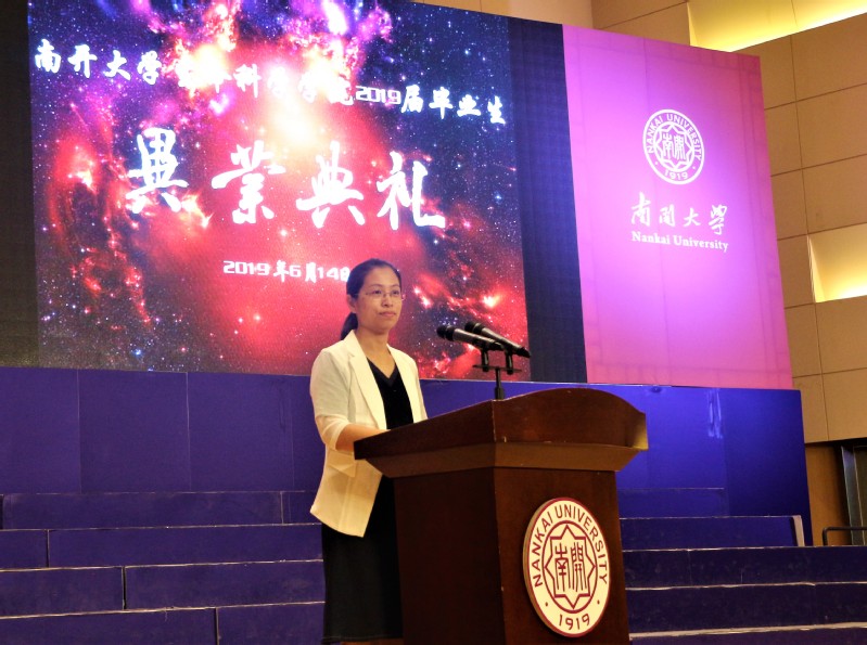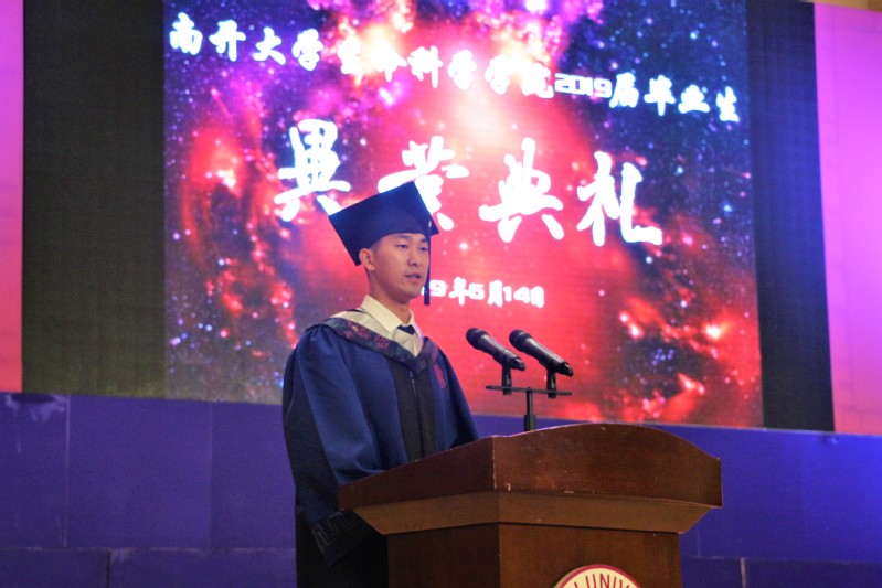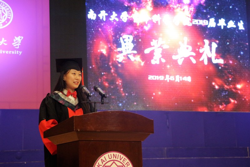 2019届本科毕业生杨子悦、硕士毕业生杨啸天、博士毕业生战捷作为代表发言。杨子悦通过回忆本科四年的点点滴滴,感受到在南开接受了最好的教育,学习了如何成为对时代和社会有用的人。杨啸天表示会牢记母校校训“允公允能,日新月异”,坚持“知中国,服务中国”的理念,走好未来的人生路,在拼搏奋进中开创美好未来。战捷分享了自己读博士期间的感悟和体会,感谢公司优良的学风和完善的实验环境助力研究生攻克难关。