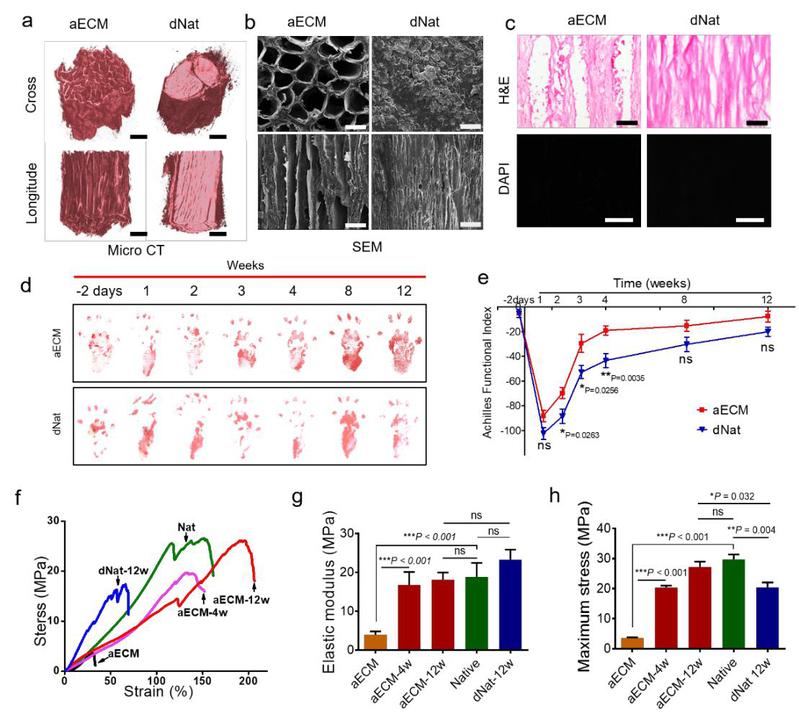 图 5. 具有取向微通道管状细胞外基质材料促进跟腱再生。