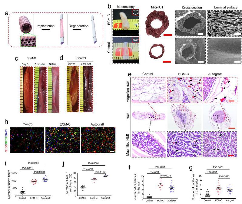 图 3. 具有取向微通道管状细胞外基质材料促进外周神经再生。