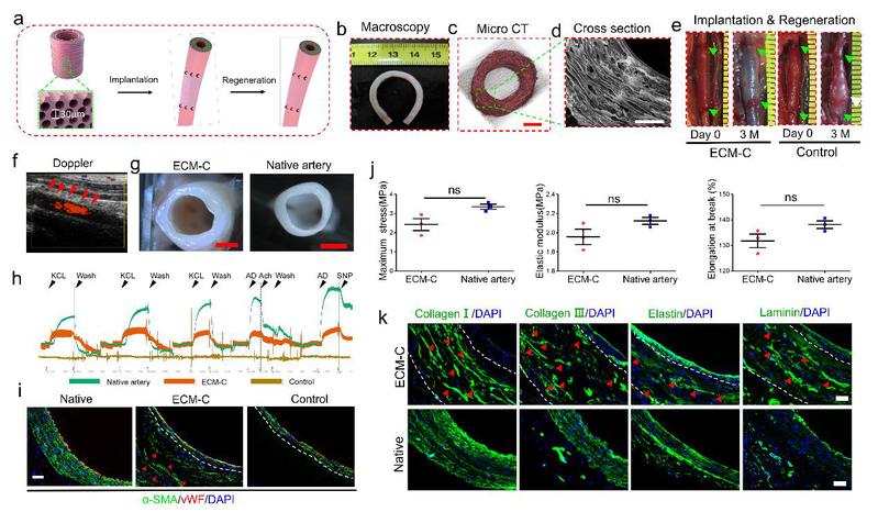 将具有圆周取向微通道的血管材料植入到大鼠腹主动脉缺损模型后,该血管材料能够引导血管平滑肌取向再生和细胞外基质取向沉积,新生血管力学与天然血管无显著差异,同时具有与天然血管类似的收缩和舒张功能(图4a-k)。而对照组血管材料多数发生动脉瘤。