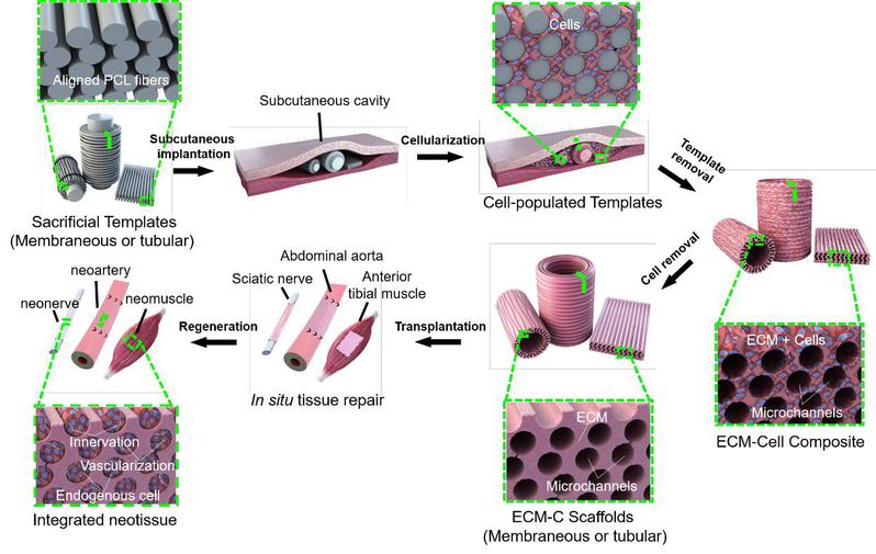 图1. 取向微通道细胞外基质支架材料构建及引导取向组织原位再生示意图。