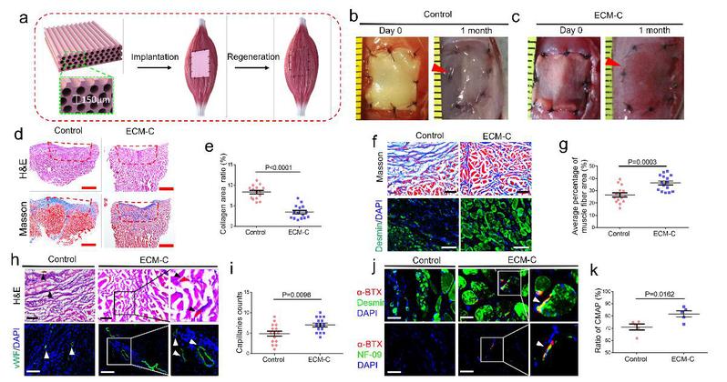 图 2. 具有取向微通道膜状细胞外基质材料促进肌肉再生。