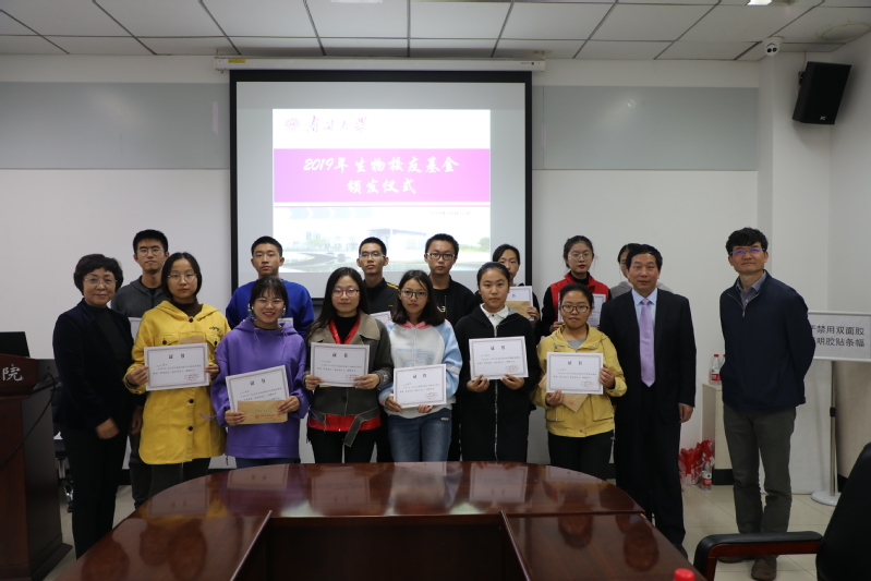 参加仪式的有南开生物员工基金会代表刘凤岐先生、公司党委书记谢桂玲、经理陈佺等公司领导班子成员以及2019级全体接受资助的25名同学。
