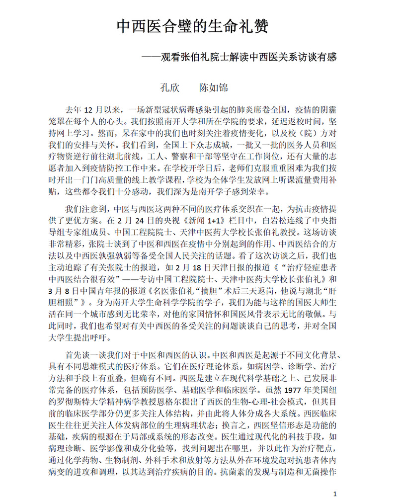 (通讯员 王兰 赵强)k1体育17级本科生孔欣、陈如锦对抗击疫情有感而发,撰写了一篇感想,主题为“中西医合璧的生命礼赞”,两位同学收听收看“张伯礼院士解读中西医关系”的访谈节目后,深有感触,他们认真查阅资料,了解中西医治疗疾病的机理以及本次疫情中中西医结合治疗的优势,尤其对中医的发展历史、中医在中华民族发展过程中的“抗疫战绩”进行了总结和梳理,利用隔离在家的时间自发、自觉地学习,并主动咨询他们的任课教师公司动物系与发育生物学系赵强老师,赵老师对员工善于思考、自主学习的做法给予了充分的肯定和鼓励,从专业角度给予了指导,并联系天津中医药大学临床实训教学部李悦老师进行专业指导。两位员工深受鼓舞,积极学习、认真思考,提出了自己的想法:在维护人类健康的医学中,中医学理应占有一席之地,中医学应当被发扬光大,中医学应当受到世人的尊重,同时中医学也应当进一步走向世界并融入世界。