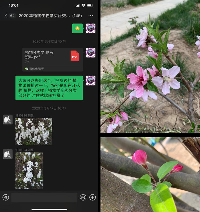 实验课旨在复习和巩固理论课所学内容的同时锻炼员工的动手能力和实践能力,且无法完全通过网络教学的形式达到预期效果。根据多年的教学辅助经验,实验室沈广爽老师对《植物学实验》的内容进行了重新梳理,将其中形态解剖部分的重点内容、注意事项、操作方法和实验结果等学习资料通过微信群发给员工,并要求同学们认真预习,在微信群内保持与同学们的互动,有问题随时提出,及时解答。而植物分类部分知识面较广,一直是《植物学实验》学习的难点,往年的实验课会根据校园的植物花期,采集不同种类的花用于植物分类训练,本年度受疫情影响,开学时已错过大多数植物的花期,所获实验材料非常少。因此沈广爽老师提前制作了植物分类学的参考资料,包括植物茎、叶、花的形态和分类学知识,并在花期对校园常见花进行拍照,发到微信群方便学习使用,同时鼓励同学们将身边的植物拍照发到群里,互相学习交流。此外,植物分类部分的知识本身比较枯燥,为了提高员工们的学习兴趣,沈老师还经常在群里推送一些分类相关的小文章,希望通过这种方式,在特殊的时期,员工们也能有所收获。