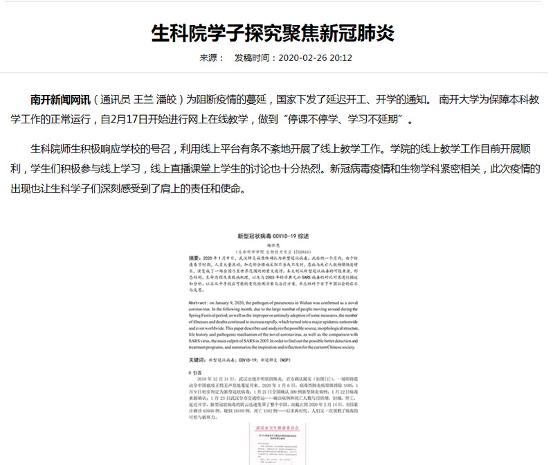 微生物生理学课程已在中国大学MOOC平台上线运行两个周期,有完整的课件讲义、视频资料及单元测试、期中和期末测试等。疫情期间,任课教师潘皎利用中国大学MOOC平台同步开展校内的线上授课,并结合雨堂课、腾讯会议、微信群等辅助教学工具进行直播授课和课堂互动等。教师同时将O-AMAS有效教学法充分运用到了本课程的线上教学中,要求员工根据目前的新冠病毒疫情,查阅最新文献资料,进行科学、系统地总结和分析,完成综述作业,实现多元学习的目标。在第一节课上就要求同学们在两周内完成一篇科研综述:“论述新型冠状病毒可能的源头、病毒的特征、传播方式、与SARS病毒的区别与亲缘关系,以及利用生物学知识如何建立快速检测、有效防护和治疗的方法?”