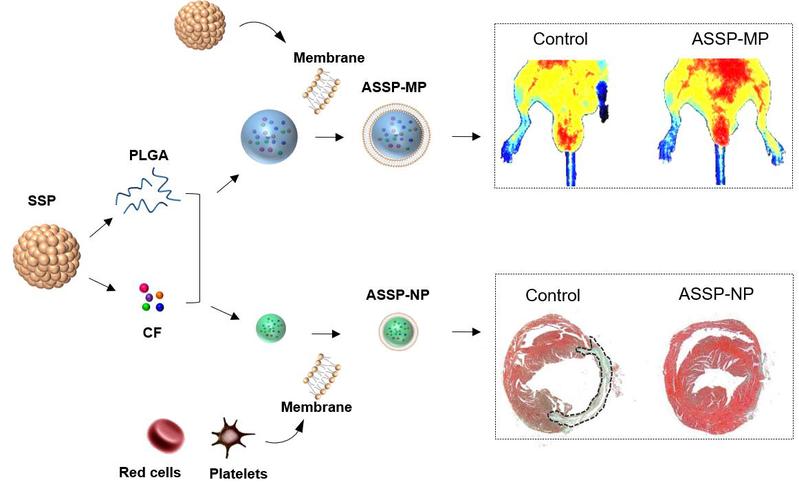 此外,为满足静脉注射的需求,研究者们还制备了纳米尺度(nano-size)的人造干细胞(ASSP-NP),并在表面包被了红细胞膜和血小板膜,来分别提高血循环时间和靶向组织缺血部位,静脉注射心肌梗死模型鼠后,ASSP-NP可以靶向到小鼠心梗部位,诱发血管再生来有效缓解心梗导致的组织坏死。