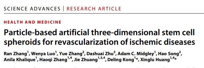 近日,k1体育黄兴禄课题组和孔德领课题组合作在Science Advances杂志上发表题目为Particle-based artificial three-dimensional stem cell spheroids for revascularization of ischemic diseases的文章。该研究创新性的利用材料技术人为重构了3D干细胞,这种人造3D干细胞(artificial stem cell spheroid, ASSP)展现出低氧细胞特性,即通过HIF-1α作为重要上游转录因子调控血管再生所需多种细胞因子,像VEGF等。研究者们还根据实际需要重建了不同尺寸和不同细胞来源的杂合细胞,弥补了细胞自身存在的多种缺陷。
