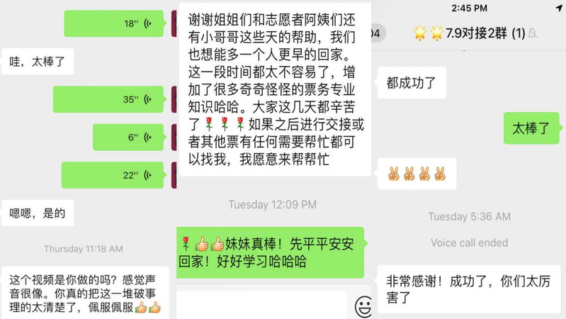 今年冬天,赴美面试的杜思灵秉着“不给国家添乱”的原则,主动在境外隔离,将回国机会让给更紧急、更需要的人。然而境外疫情爆发后,机票受限,航班取消,回国愈发困难。查询机票信息的过程中,杜思灵加入了由志愿者组织的微信群,与同胞交流信息、讨论路线。在志愿者以及热心同胞的无私帮助下,杜思灵几经辗转,奔波数地,终于回到祖国。