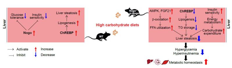 研究人员发现,高碳水化合物食物通过激活碳水化合物反应元件结合蛋白 (ChREBP)和降低胰岛素敏感性造成野生型小鼠肝脏脂肪变性和代谢紊乱。同时,高碳水化合物食物通过刺激Nogo-B基因表达进一步加剧胰岛素抵抗。与野生型小鼠相反,高碳水化合物食物在Nogo基因敲除小鼠中无法刺激肝脏Nogo-B基因表达,表现为肝脏Nogo-B基因的缺失增强胰岛素敏感性,降低ChREBP表达和活性以及脂质合成相关分子表达,并伴随着能量代谢相关基因的激活和能量代谢的升高,从而拮抗了由高碳水化合物食物诱导的肝脏脂质积累、胰岛素抵抗以及其他代谢紊乱。进一步,野生型小鼠注射Nogo小干扰RNA敲减肝脏Nogo-B也可显著改善高果糖饮食诱导的代谢损伤。