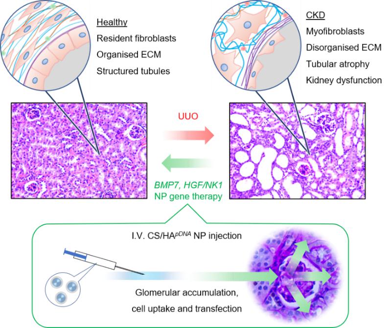 图1.透明质酸包被的壳聚糖-pDNA纳米颗粒(CS/HApDNA NPs)的疗效示意图。ECM:Extracellular matrix; CKD:Chronic kidney disease