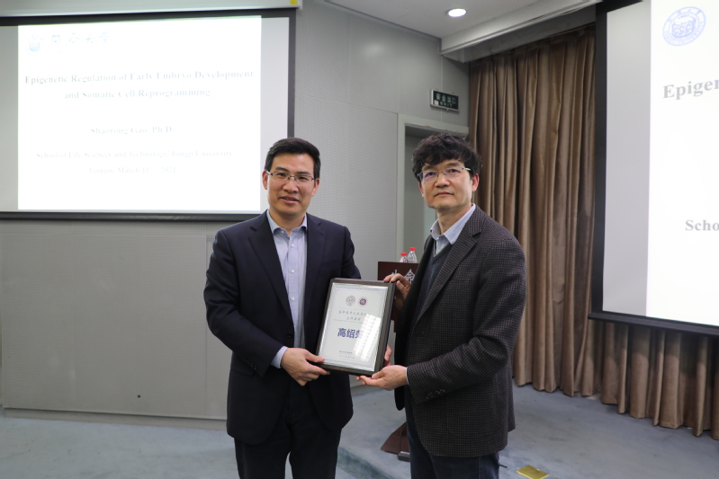 2021年3月11日,同济老员工命科学与技术公司高绍荣教授应公司刘林教授之邀做客“百年南开之生命讲坛”,在生物站报告厅做了题为“Epigenetic regulation of early embryo development and somatic cell reprogramming(早期胚胎发育和体细胞重编程的表观遗传调控)”的学术报告。报告前,陈佺经理向高绍荣教授赠送了“百年南开之生命讲坛”主讲人纪念牌。
