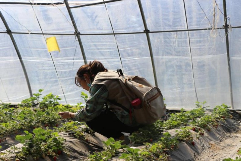 经过示范与培训,同学们观察了白粉病草莓和害虫危害草莓,进行了草莓采摘,并体验了生物食诱剂的施用过程。