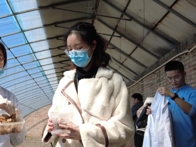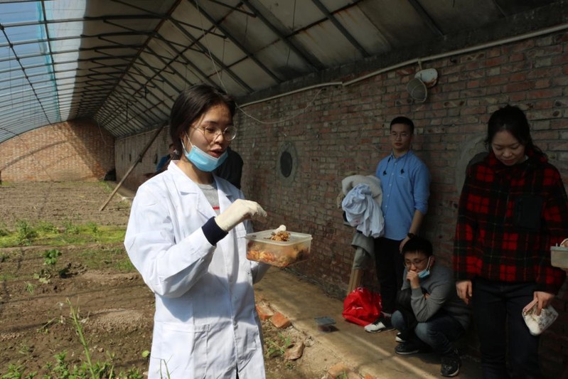 在韭菜大棚,阮维斌教授及其实验室团队依次进行了介绍。韭菜是特别容易遭受害虫侵害的蔬菜,因此韭菜的农药残留问题长期难以解决,其高附加值也表明研究生物防治技术刻不容缓。针对此问题,阮维斌教授科研团队按照“以虫治虫”的治理思路,天敌昆虫病原线虫侵入到昆虫体内,利用其释放的共生细菌杀死害虫,既能实现防治害虫的效果,也不影响食品安全。李晶晶博士介绍了线虫的采集和培养过程,并现场展示了经线虫侵染的大蜡螟幼虫;张壬嘉同学讲解了用黄粉虫代替大蜡螟来降低成本的实验过程,并提出了未来的实验优化目标是提高侵染率;方明博士展示了生物防治虫尸剂的施用正确流程及注意事项;陈如锦同学进行了成果展望,未来亟待解决寻找更适合农村的培养介质、成果商品化、简化黄粉虫的预处理过程等问题。