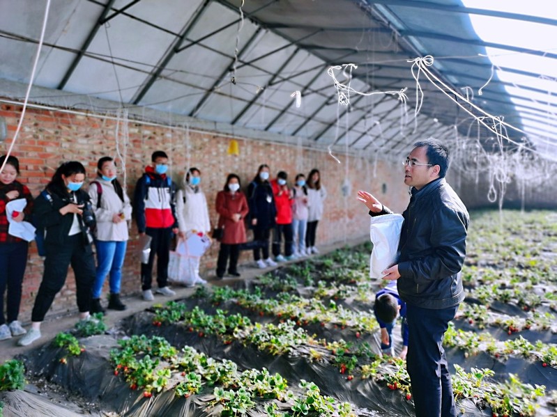 在有机草莓种植大棚里,阮维斌教授从食品安全、乡村振兴、助人精神三个角度解释了做病虫害生物防治的初心。针对草莓最常见的害虫,蛞蝓和蜗牛,阮维斌教授团队研制的生物食诱剂既能保证消费者吃到嘴里的草莓是安全的,也能降低病虫害导致的损失,实现农民的增收,大大优于传统的化学防治技术。同时,阮维斌教授也谈到了生物防治技术的未来。很多领域需要原创技术,比如在农药降解菌、重金属如何富集在非食用部分,生物防治技术还有无限前景。阮维斌教授通过自己扎根农村的经历鼓励同学们,农村还存在着很多社会问题,能为新农村的建设发出南开的声音,是一件非常好的事,要有充分的耐心去做一件事情,激发内心的光明,不求回报。