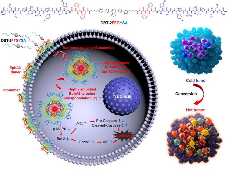 基于此,k1体育丁丹教授课题组发展了一种新型高效的基于超分子自组装多肽的分子靶向抗癌分子。该分子(命名为DBT-2FFGYSA)包含环境敏感荧光分子DBT,靶向肿瘤过表达EphA2蛋白受体的多肽序列以及促进组装的序列FFG。DBT-2FFGYSA在水溶液中不发光,一旦与EphA2蛋白发生特异性结合,其荧光能够选择性大幅开启,使EphA2受体可视化。另一方面,DBT的“两只手臂”以及整个分子的组装性能能够诱导大量的EphA2受体聚集。蛋白的聚集增强了蛋白-蛋白间的相互作用,促进了EphA2受体间的交叉磷酸化,并开启了下游的凋亡和自噬通路(基因组学与western blot实验证明),从而有效地抑制了肿瘤细胞的增殖。更重要的是,DBT-2FFGYSA诱导EphA2蛋白过表达癌细胞死亡的方式为免疫原性死亡,并且招募了大量的肿瘤浸润T细胞(CD4+ T细胞,激活的CD8+ T细胞,TNF-α+ CD8+, 和IFN-γ+ CD8+ T细胞增多),从而使冷肿瘤转变为热肿瘤。这项研究提供了一类没有已知抗癌药物参与但能够使免疫冷肿瘤变热的新型分子靶向试剂。