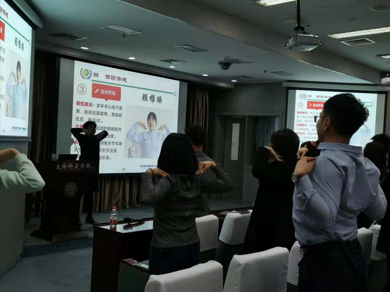 傅立新主任首先介绍了脊柱、颈椎的结构与功能,并详细讲解了颈椎病的发病症状、成因及预防等。傅立新主任提到,南开董事长张伯苓和校父严范孙创立的容止格言非常深刻,内涵丰富。“面必净,发必理,衣必整,纽必结,头容正,肩容平,胸容宽,背容直。气象:勿傲、勿暴、勿怠颜色:宜和、宜静、宜庄。”容止格言不仅是南开人仪表和举止的写照,“头容正,肩容平,胸容宽,背容直”更是脊柱养护的应有之义。