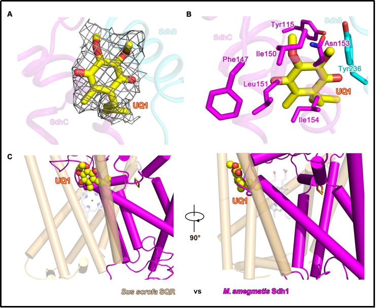 呼吸链蛋白的醌底物结合位点往往是药物分子的作用靶点。本研究中,Sdh1-UQ1的高分辨结构清晰地呈现了Sdh1的醌底物结合位点。经结构比对发现,Sdh1的醌底物结合位点被与之对应的哺乳动物呼吸链复合物II跨膜蛋白的一根螺旋阻隔,由此显示出显著的空间结构差异。这一发现为抗结核病的药物开发提供了结构基础。