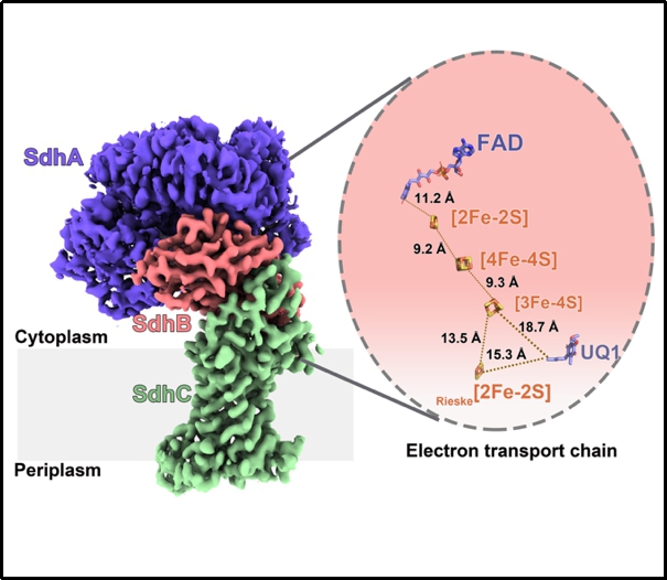 近些年,以能量代谢系统为靶点的研究已成为抗结核药物开发的重要方向。呼吸链复合物II又叫做琥珀酸脱氢酶(SQR)或富马酸还原酶(QFR),它是连接呼吸作用与三羧酸循环的关键膜蛋白,同时调控着物质代谢与能量转化过程。研究表明,结核分枝杆菌的Sdh1蛋白作为一种新型(Type F)的呼吸链复合物II对于结核分枝杆菌的氧适应性调控至关重要,是结核分枝杆菌生长和生存必需的蛋白。然而,关于Sdh1蛋白的三维结构信息及其电子传递机制目前尚不清楚,限制了针对该靶点的抗结核药物研发。