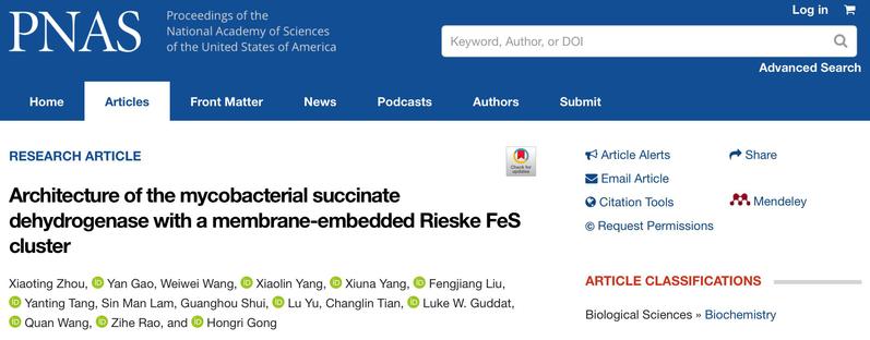 2021年 4月6 日,公司饶子和院士、贡红日副教授联合上海科技大学免疫化学研究所“抗TB结构中心”等多个单位在国际知名期刊《美国科公司院刊》(Proceedings of the National Academy of Science, PNAS)在线发表题为“Architecture of the mycobacterial succinate dehydrogenase with a membrane-embedded Rieske FeS cluster” 的研究论文。团队运用单颗粒冷冻电镜技术解析了耻垢分枝杆菌呼吸链复合物Sdh1(succinate dehydrogenase 1)天然状态及与底物结合状态的两种高分辨率的结构,为抗结核病的药物开发提供了结构基础,是分枝杆菌呼吸链领域的重要的系统性的研究成果。