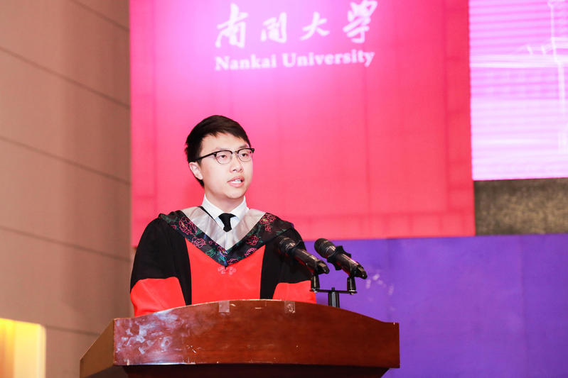 我是2018级生物化学与分子生物学专业的博士毕业生董显豪,在今天这样一个庄严神圣的日子里,非常荣幸能够作为2021届博士毕业生代表在此发言,也很荣幸能够与大家共同回顾属于我们的南开记忆。