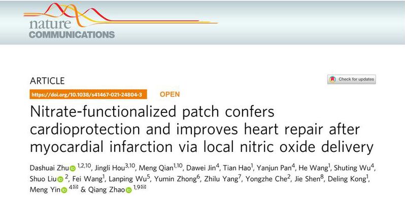 日前,k1体育暨药物化员工物学国家重点实验室赵强教授课题组在心肌梗死治疗方面取得新进展。团队提出局部微环境响应释放一氧化氮治疗心梗新策略,并设计制备了新型硝酸酯功能化心肌补片。该材料可利用心肌梗死区域低氧和酸性微环境在体内转化产生NO,有效发挥NO心肌保护功能,并促进梗死心肌的修复再生。相关研究成果以“Nitrate-functionalized patch confers cardioprotection and improves heart repair after myocardial infarction via local nitric oxide delivery”为题于近日在线发表在Nature communications上(2021, 12: 4501, DOI: 10.1038/s41467-021-24804-3)。