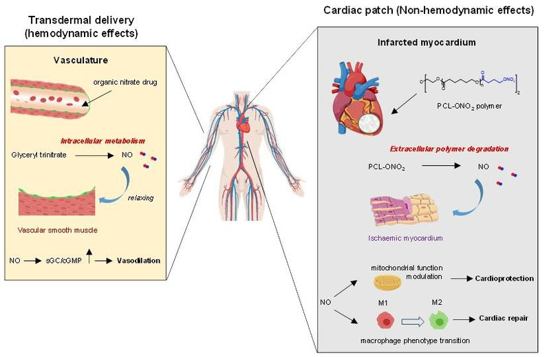 同小分子硝酸酯类药物相比,由于高分子材料不能跨过细胞膜,因此可在心肌组织原位转化形成NO,更好地发挥心脏保护功能。同时可以有效解决小分子硝酸酯药物全身性递送导致的反射性心动过速和低血压等不良反应。