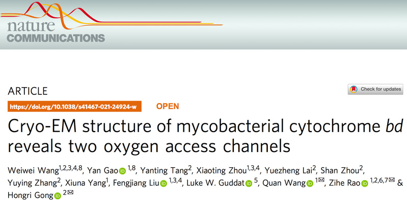 2021年7月30日,贡红日副教授、饶子和院士联合上海科技大学免疫化学研究所王权研究员等多个课题组在国际知名期刊Nature Communications在线发表题为“Cryo-EM structure of mycobacterial cytochrome bd reveals two oxygen access channels”的研究论文。团队利用单颗粒冷冻电镜技术解析了耻垢分枝杆菌细胞色素bd复合物的高分辨率(2.8 Å)结构,结合生化实验揭示了一种独特的醌氧化与氧还原相偶联的催化机制。研究成果为抗结核药物的发现奠定了重要基础。