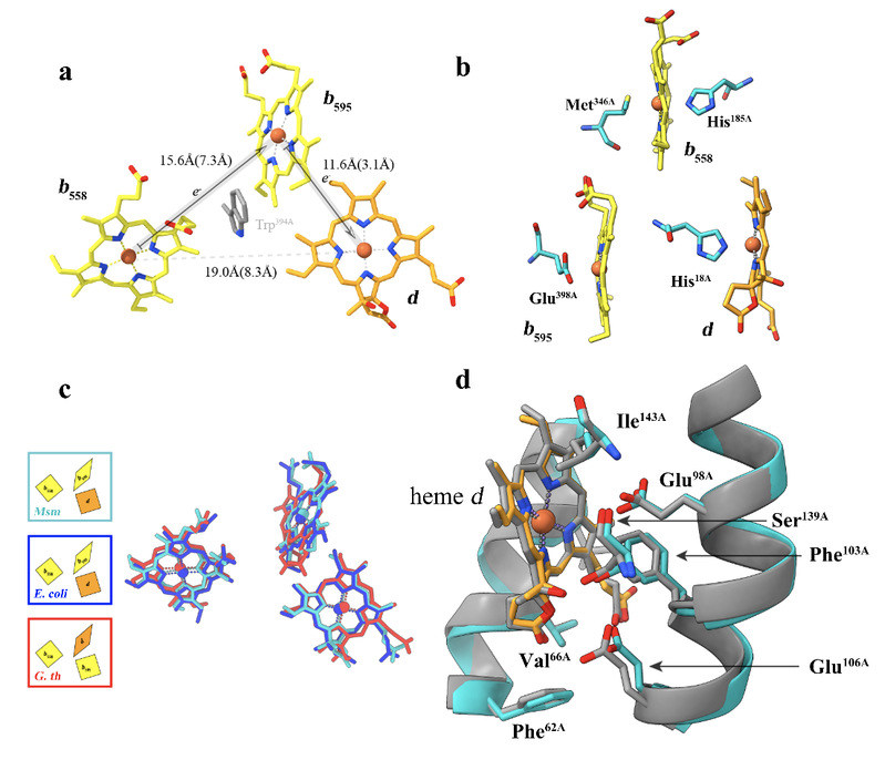 细胞色素bd复合物中血红素辅基是电子传递的载体及氧还原的反应中心。虽然耻垢分枝杆菌细胞色素bd复合物属于S家族,但是其低自旋血红素b558、高自旋血红素b595和d排布却类似于L家族的E. coli,暗示了分枝杆菌细胞色素bd复合物中电子的传递路径。