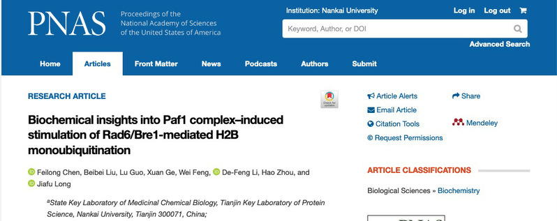 8月12日,k1体育/药物化员工物学国家重点实验室龙加福教授研究团队在Paf1复合物促进H2B单泛素化的生化机制研究上获得重要进展,介绍该成果的论文《Biochemical Insights into Paf1 Complex-induced Stimulation of Rad6/Bre1-mediated H2B Monoubiquitination》已经在美国国家科公司院刊PNAS杂志上在线发表。
