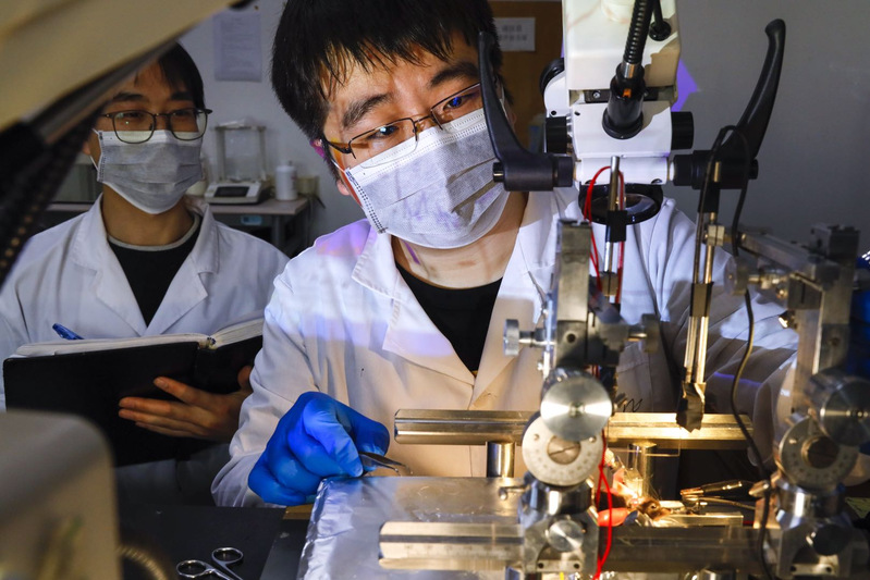 作者王晖博士和许心心博士正在k1体育(生物楼221室)进行神经电生理实验