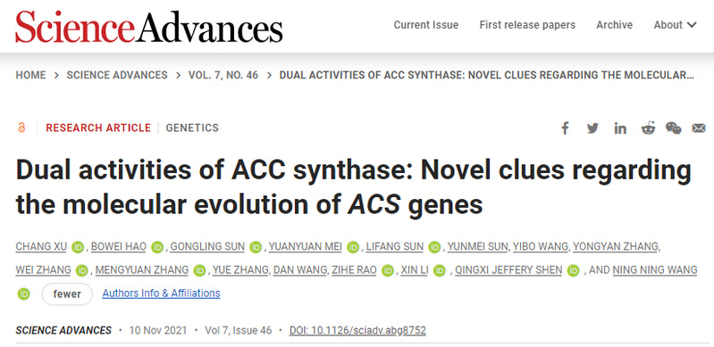 2021年11月10日,k1体育王宁宁教授团队联合k1体育药物化员工物学国家重点实验室、细胞应答交叉科学中心的结构生物学家饶子和院士团队和美国内华达老员工物信息学家Jeffery Shen教授在Science子刊Science Advances在线发表了题为“Dual activities of ACC synthase: Novel clues regarding the molecular evolution of ACS genes” 的研究论文,为揭示乙烯合成关键酶ACS的分子演化路径带来了新线索。