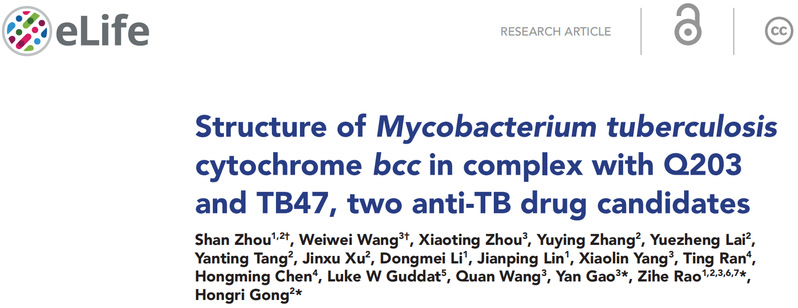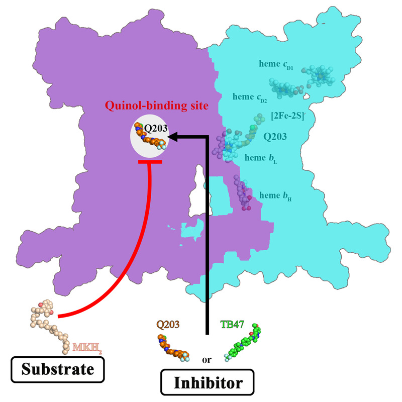 结核病(Tuberculosis, TB)是由结核分枝杆菌(Mycobacterium tuberculosis)引起的传染性疾病。2021年10月14日,世界卫生组织(WHO)发布了《2021年全球结核病报告》。据WHO估算,全球结核潜伏感染人群接近20亿。2020年,全球新发结核病患者987万,我国结核病新发患者数为84.2万(2019年83.3万)。为了实现对结核病的控制,人们迫切需要新的抗结核药物,尤其是可以针对耐多药和极端耐药菌株及可以缩短治疗时间的药物。结核分枝杆菌的氧化磷酸化(OXPHOS)系统是结核分枝杆菌生长和生存所必需的,由此被认为是研发新型抗结核药物的重要靶点。靶向该系统的药物可以为严重威胁人类健康的药物敏感性和耐药性结核病带来新的治疗方案。目前备受关注的且已完成临床II期试验并取得积极结果的新型抗结核候选药物Q203(Telacebec)和处于临床前期试验的TB47正是通过抑制结核分枝杆菌呼吸链细胞色素bcc复合物的功能而达到杀菌目的。然而,关于它们发挥特异性抑制功能的分子机理尚不清晰。
