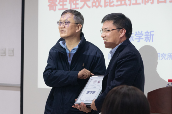 2021年11月25日,应k1体育肖金花教授、卜文俊教授邀请,浙江大学昆虫科学研究所陈学新教授做客“百年南开之生命讲坛”,在四教101报告厅作了题为“寄生性天敌昆虫控制害虫的机制研究”的学术报告。报告开始前,卜文俊教授向大家介绍了陈学新教授的教育和研究经历、主要研究成果及所获得的重要奖项,并为陈学新教授颁发了“百年南开之生命讲坛”主讲人纪念牌。