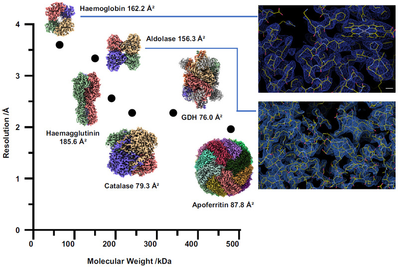 基于孙飞课题组和乔明强课题组的前期工作,双方研究人员利用疏水蛋白HFBI自组装形成的连续二维晶体薄膜来覆盖微孔阵列非晶镍钛合金膜载网(图2),用于冷冻电镜样品制备。该载网天然亲水,无需做辉光放电处理,通过静电相互作用吸附蛋白颗粒来克服样品与气液界面接触的问题。此外,该支持膜能够帮助形成更均匀更薄的玻璃态冰,背景衬度低,有利于高分辨率和高信噪比的冷冻电镜成像。在本项研究中,研究人员用该载网成功解析了6种蛋白质的高分辨率冷冻电镜结构(图3),其中包括两个在过去冷冻电镜实验中具有明显取向优势的蛋白质样品——过氧化氢酶catalase和流感病毒血凝素HA,分子量最小可达64 kDa。这些研究结果表明该新型冷冻电镜支持膜载网可以有效解决气液界面效应,对不同分子量的样品具有广泛的适用性。此外,在本项研究中,研究人员证明了该疏水蛋白膜是通过静电相互作用来吸附蛋白颗粒,这个相互作用可以改变样品溶液的pH值来进行调节,从而为后期人们使用该支持膜载网提供了明确的优化方向和手段。