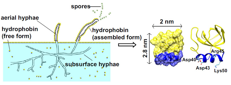 图1. 真菌疏水蛋白生理功能及HFBI结构示意图