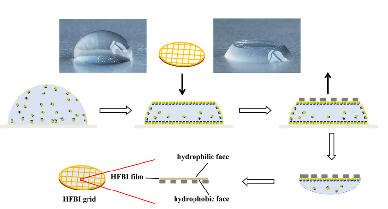 近年来,由于硬件和图像处理算法上的不断突破,冷冻电镜单颗粒技术已经成为研究生物大分子复合体三维结构的主要研究手段之一,并已经达到了原子分辨率的水平。冷冻电镜技术流程中的关键步骤包括了冷冻样品的制备,将生物大分子样品快速冷冻在玻璃态冰中,用于下一步的冷冻电镜成像。然而,由于在传统冷冻制样过程中的气液界面效应,人们经常遇到颗粒不进孔、分布不均匀、取向优势严重、蛋白质变性等问题,导致无法解析样品的高分辨率三维结构,成为利用冷冻电镜解析生物大分子复合体高分辨率三维结构的关键瓶颈之一。真菌疏水蛋白是一类由高等丝状真菌分泌的小分子量蛋白质(7-15kDa),是目前已知表面活性最强的蛋白质之一。在真菌不同发育阶段中,真菌疏水蛋白发挥了关键作用,如在菌丝和孢子表面自组装形成两亲性蛋白膜,打破气液界面张力,从而促进孢子萌发、菌丝生长及宿主侵染。疏水蛋白HFBI是一类由瑞氏木霉生产的II型疏水蛋白,可以在气液界面处自组装成单层、高度有序的二维晶体结构(图1)。