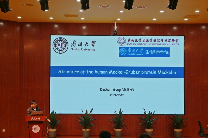 研究员龚德顺做了题为“Structure of the human Meckel-Gruber protein Meckelin”的报告,研究解析了Meckel-Gruber综合症关键蛋白Meckelin的冷冻电镜结构,发现了Meckelin单体与单体之间通过四个区域的广泛结合形成的稳定二聚体,同时进一步将疾病相关突变体定位到结构上发现二聚体可能是Meckelin发挥功能所必需的。