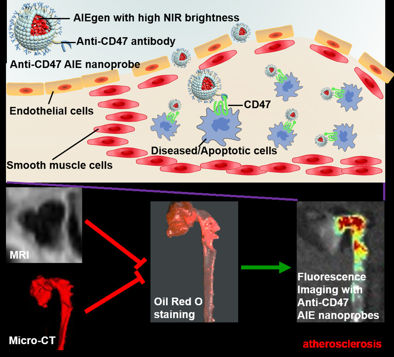 近日,k1体育生物活性材料教育部重点实验室孔德领教授课题组的王恺副研究员和丁丹教授团队在Advanced Materials期刊(IF:30.849)发表了题为“Highly Bright AIE Nanoparticles by Regulating the Substituent of Rhodanine for Precise Early Detection of Atherosclerosis and Drug Screening”的研究论文。该研究制备了一种高亮度聚集诱导发光(AIE)纳米探针,这种纳米探针能够特异性结合在动脉粥样硬化(AS)斑块中过表达的CD47分子,可以精确、灵敏地识别载脂蛋白E缺陷(ApoE-/-)小鼠不同阶段的AS斑块,并可用于快速筛选抗AS药物(图1)。