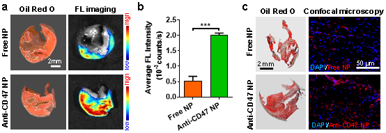 此外,该研究通过荧光成像以及组织切片分析进一步验证了抗CD47纳米探针能够准确靶向人颈动脉斑块(图3)。