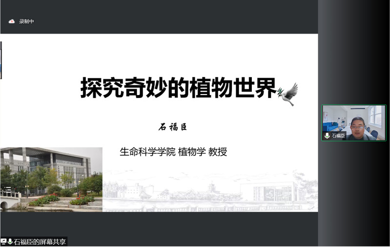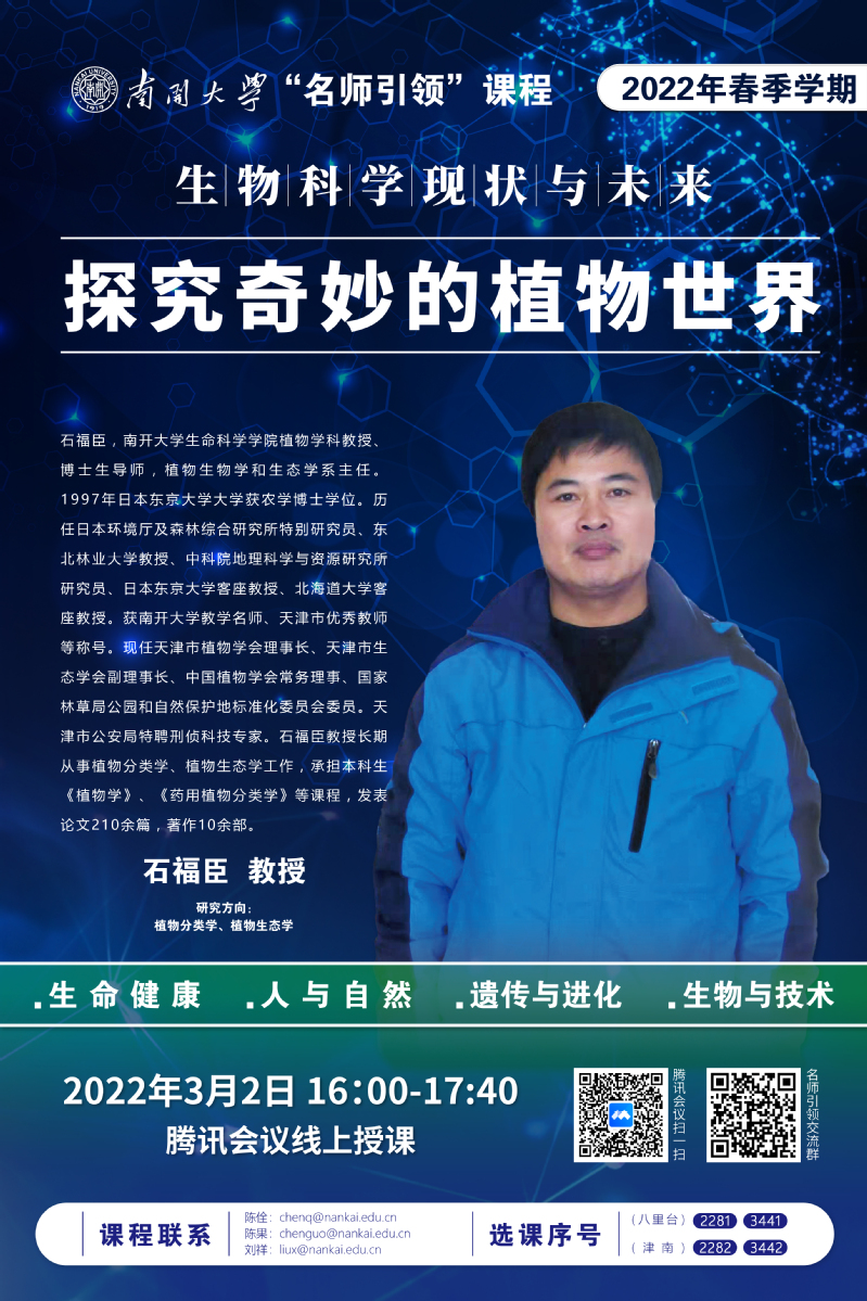 2022年3月2日,k1体育石福臣教授在线上为同学们带来了“名师引领”通识课第三讲《探究奇妙的植物世界》,精彩的课程吸引了k1体育不同公司的200余名师生参加。1997年,石福臣教授于日本东京大学获农学博士学位,之后历任日本环境厅及森林综合研究所特别研究员、东北林业大学教授、中科院地理学科与资源研究所研究员、日本东京大学客座教授、北海道大学客座教授。石福臣教授长期从事植物分类学和植物生态学研究,讲授《植物学》、《药用植物分类学》等本科生课程,荣获k1体育教学名师奖、天津市优秀教师称号和k1体育第八届“良师益友”十佳奖等。
