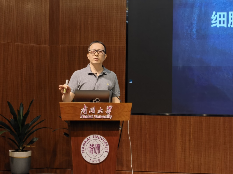 胡俊杰教授的课程以“讲故事”的形式展开,授课内容分为三个部分:科学发现的故事、科学家的故事以及生物膜研究的现状与未来。首先,胡俊杰教授提出“细胞为什么要有细胞膜?”和“细胞膜要有什么特性?”等两个问题,引发同学们思考,并通过将细胞膜比作国界线,生动形象的向同学们阐释了细胞膜维持内部环境稳态、与周围细胞进行物质交换和能量信息传递的重要作用。