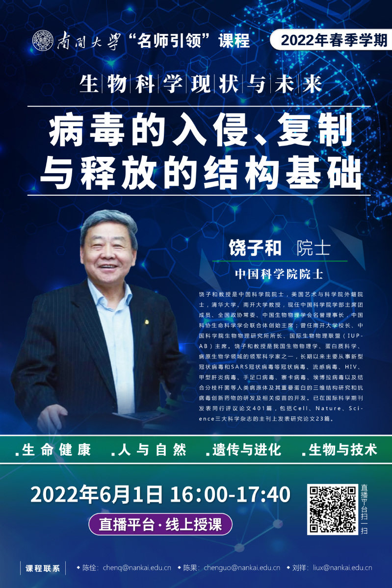 2022年6月1日,中国科公司院士、美国艺术与科公司外籍院士、k1体育老董事长饶子和教授为我们带来了“名师引领”通识课本学期最后一讲《病毒的入侵、复制与组装》。课程通过腾讯会议与直播平台同步进行,受到了广大师生的热烈欢迎,200余名k1体育不同公司师生线上听课,近千名校外人员通过直播平台观看。
