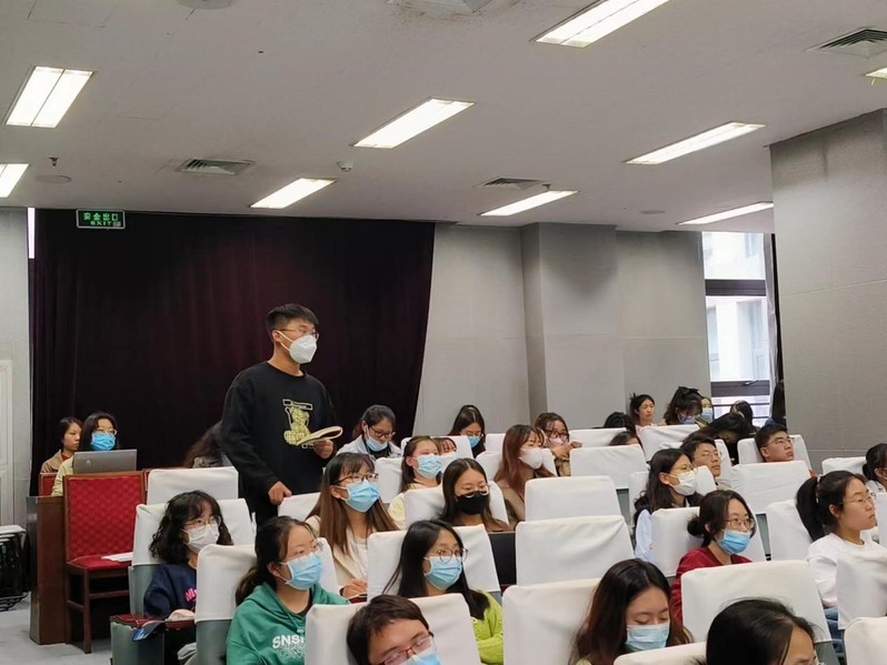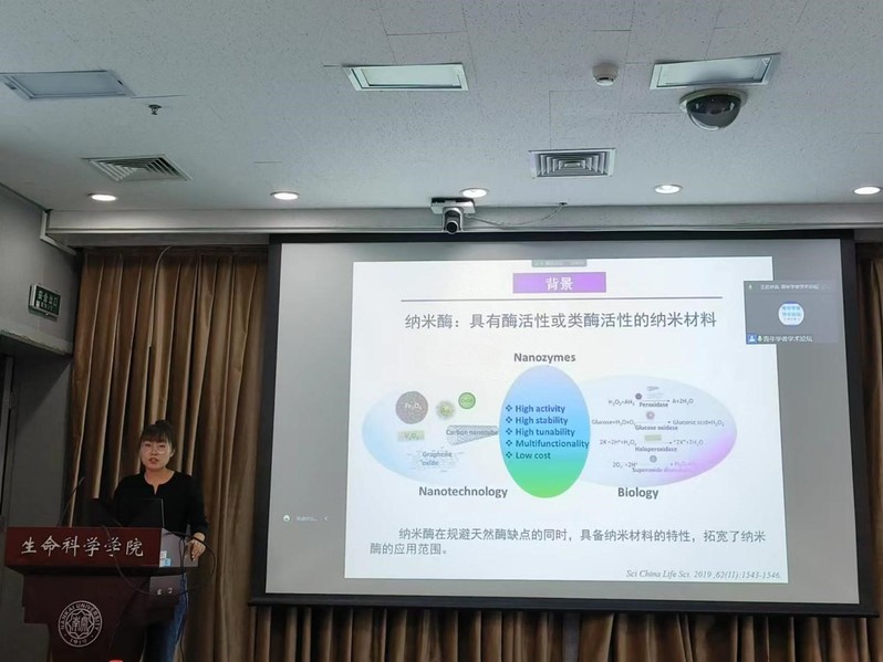 2021级博士生吴瑾为同学们讲述了基于铁蛋白的超小纳米酶的筛选过程,分享了让其在酶活性比较上成为可能的方法,并向同学们分享了将纳米酶与人造细胞结合起来模拟细胞酶促反应的整体调控过程。