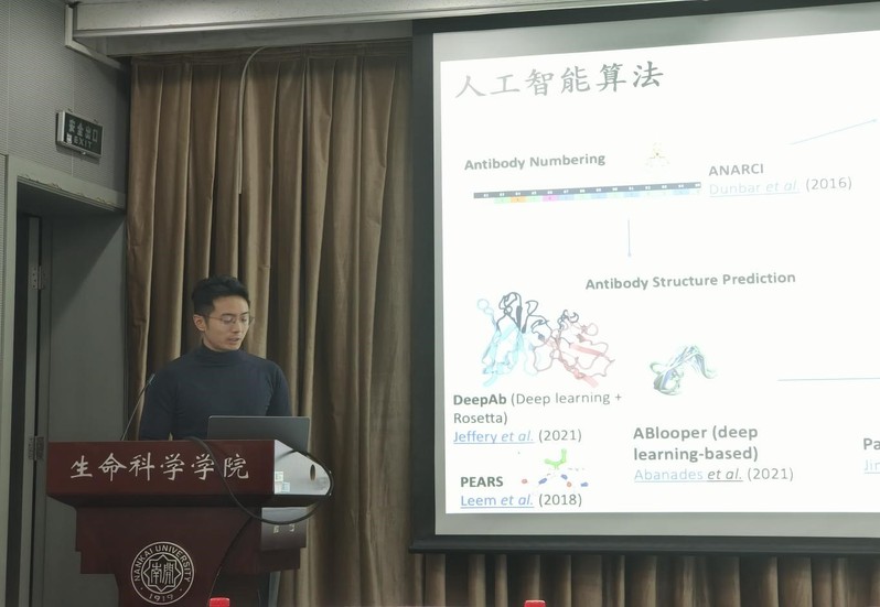 楼瀚涛副教授详细介绍了新冠病毒特异性抗体预测平台的设计思路,以及该平台所具有的优势。他讲到,该平台通过实验得到有效预测模型,并成功取得非训练集包含的抗原,结果符合生物学逻辑,最终成功地辅助研发出两个广谱中和抗体序列。在分享中,楼教授还介绍了更多深度学习辅助抗体研发的方向。