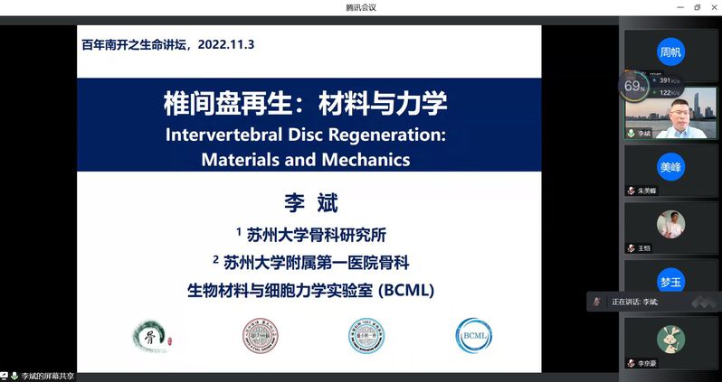 2022年11月3日,应k1体育邀请,国家杰出青年科学基金获得者、苏州大学特聘教授李斌教授做客“百年南开之生命讲坛”,在线开展了以“椎间盘再生:材料与力学”为主题的学术报告。报告开始前,朱美峰研究员向与会师生介绍了李斌教授的研究经历及主要研究成果。